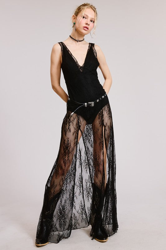 “LEAH” VNECK BODYSUIT WITH SHEER LACE MAXI DRESS